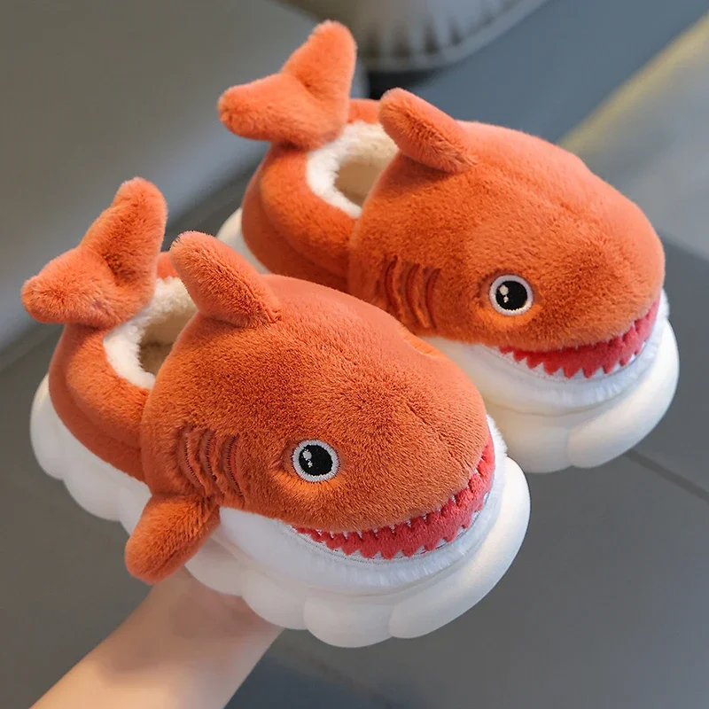 New Winter Wrap Heels Cute Cartoon Shark Cotton Slippers Children's Non-slip Soft For Kids Girls Boys Baby Warm Plush Home Shoes
